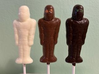 solid Chocolate lollipops to look like mummy's. with funny colored eye's approx. 1 oz