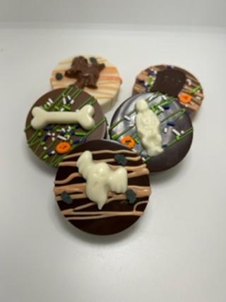 sandwich cookies dipped in chocolate then decorated with more chocolate Halloween decorations