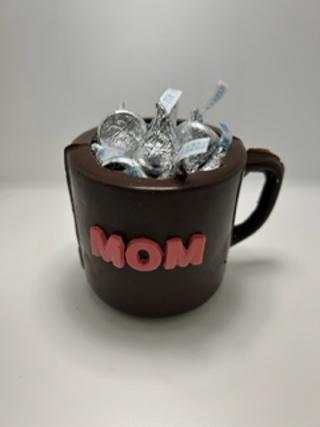 This is a totally edible mug in Dark chocolate, the letters mom are in white chocolate then filled with Hershey Kisses