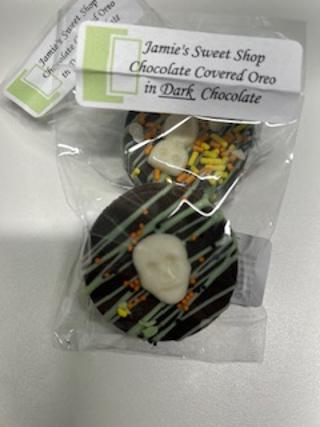 the skull is made in White chocolate. The cookie we use is a Oreo and hand dipped in Dark Chocolate then drizzled with white chocolate and sprinkled with yellow and orange sprinkles