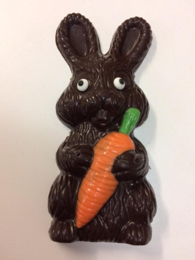 This Rabbit is hand painted with white chocolate orange and green. then hand poured in your favorite flavor of Chocolate