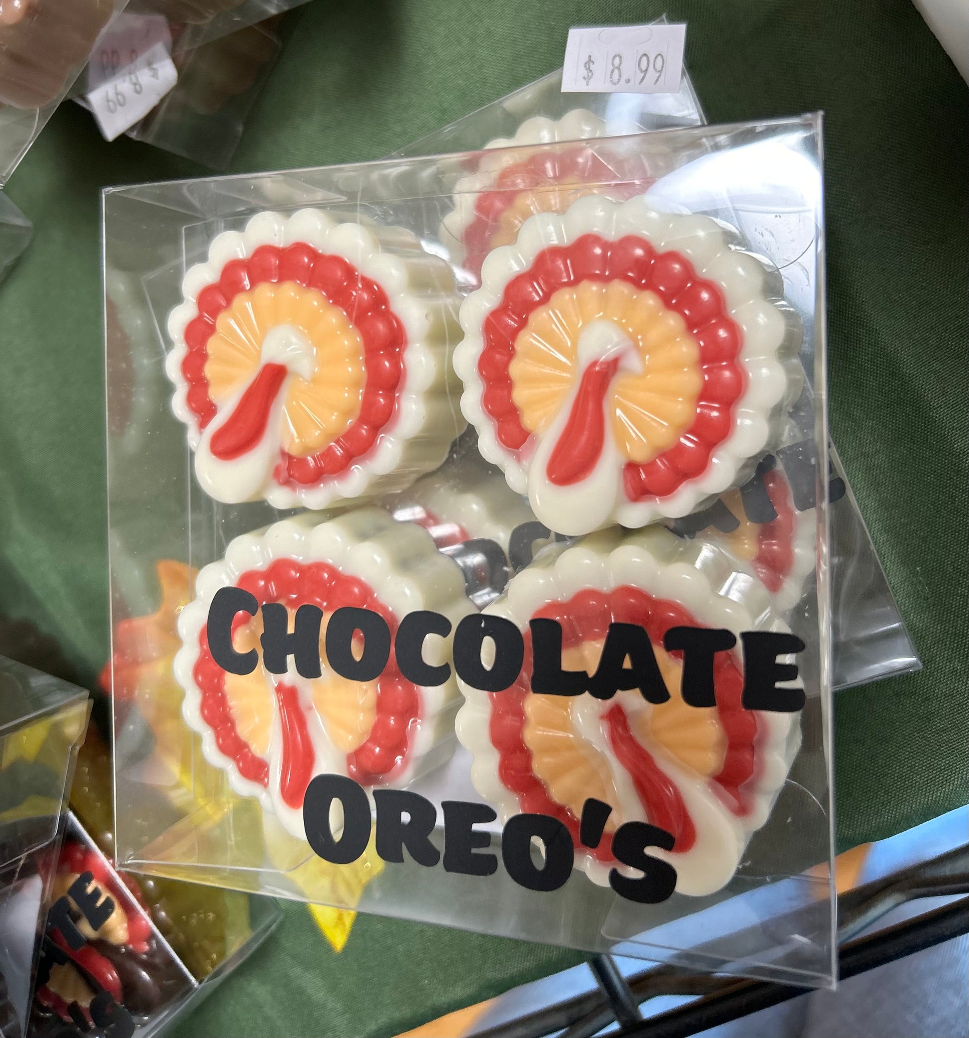 These Thanksgiving Oreo's are decorated with turkeys in colors of red and yellow in white chocolate and filled with milk chocolate.